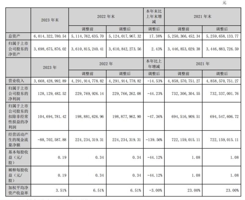 年報顯示,航錦科技在2023年度合并報表口徑實現(xiàn)營業(yè)收入36.68億元,同比下滑14.53%;實現(xiàn)歸屬于上市公司股東的凈利潤1.28億元,同比下滑44.23%;實現(xiàn)歸屬于上市公司股東的扣非后凈利潤1.05億元,同比下滑47.36%。