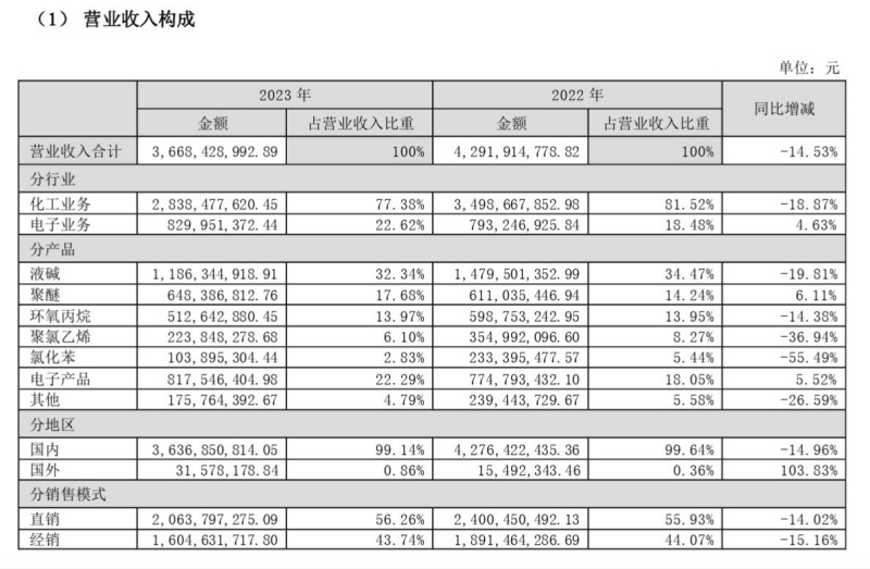 化工板塊是航錦科技的傳統(tǒng)業(yè)務,主要產(chǎn)品包括燒堿、液氯、氯化苯、環(huán)氧丙烷、聚醚及聚氯乙烯等,以“燒堿、環(huán)氧丙烷、聚醚”三大產(chǎn)品為主。2023年度,航錦科技的化工業(yè)務收入占營業(yè)收入的比重為77.38%,2022年度該比例為81.52%。