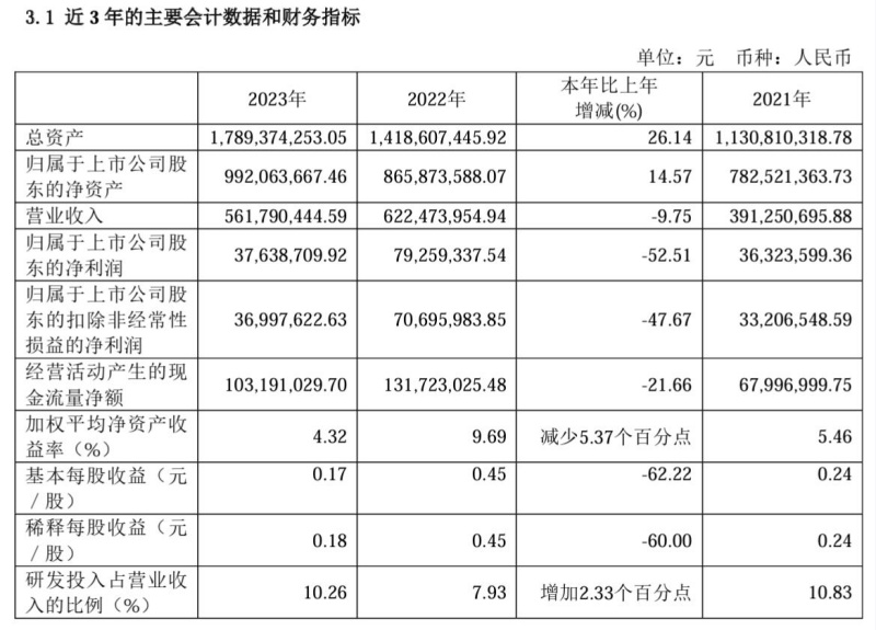 根據(jù)年報,煜邦電力在2023年度實現(xiàn)營業(yè)收入5.62億元,同比減少9.75%;實現(xiàn)歸屬于上市公司股東的凈利潤3763.87萬元,同比下降52.51%;實現(xiàn)扣除非經(jīng)常性損益后的歸屬于上市公司股東的凈利潤3699.76萬元,同比下降47.67%。