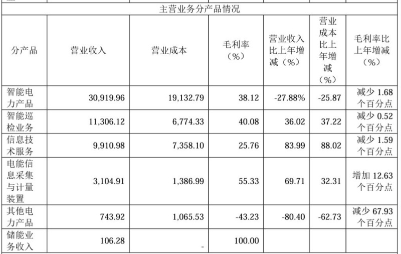 其中,智能電力產(chǎn)品是煜邦電力營業(yè)收入的最大來源,2023年度該業(yè)務收入為3.09億元,占主營業(yè)務收入的55.12%,比上年下降了27.88%,是除了“其他電力產(chǎn)品”之外在該年度收入出現(xiàn)下降的產(chǎn)品;同時,智能電力產(chǎn)品的毛利率同比減少1.68個百分點,是四大主要業(yè)務之中毛利率下降最多的一個。
