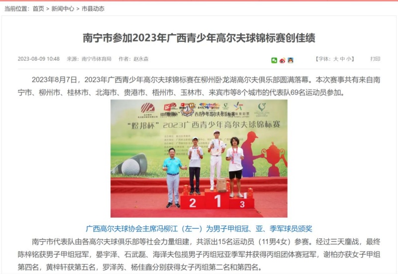 根據(jù)廣西壯族自治區(qū)體育局網(wǎng)站信息,2023年8月7日,馮柳江以廣西高爾夫球協(xié)會主席的身份為“2023年廣西青少年高爾夫球錦標賽”男子甲組冠軍、亞軍、季軍球員頒獎。