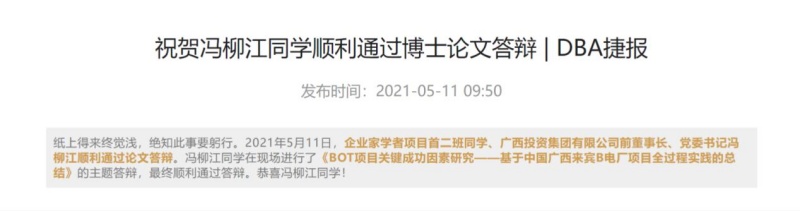 值得一提的是,馮柳江在2017年退休之后還攻讀了博士學位。據(jù)長江商學院官方網(wǎng)站(www.ckgsb.edu.cn)信息,馮柳江于2021年5月11日順利通過博士論文答辯,答辯的主題是《BOT項目關(guān)鍵成功因素研究——基于中國廣西來賓B電廠項目全過程實踐的總結(jié)》。