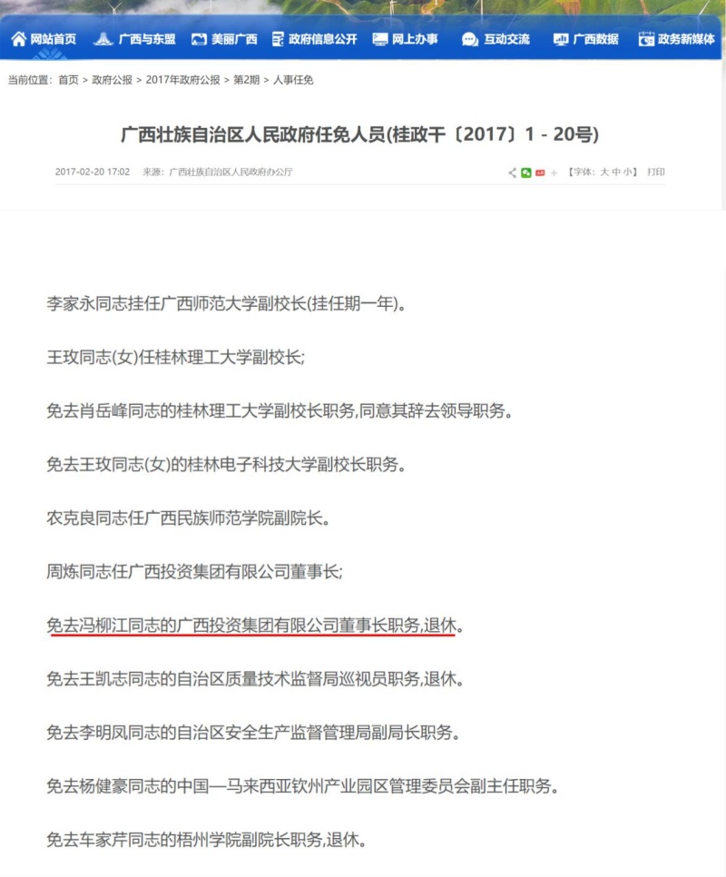 廣西壯族自治區(qū)政府網(wǎng)站于2017年2月20日發(fā)布了《廣西壯族自治區(qū)人民政府任免人員(桂政干〔2017〕1-20號)》,其中顯示:“免去馮柳江同志的廣西投資集團有限公司董事長職務,退休?!?/p>