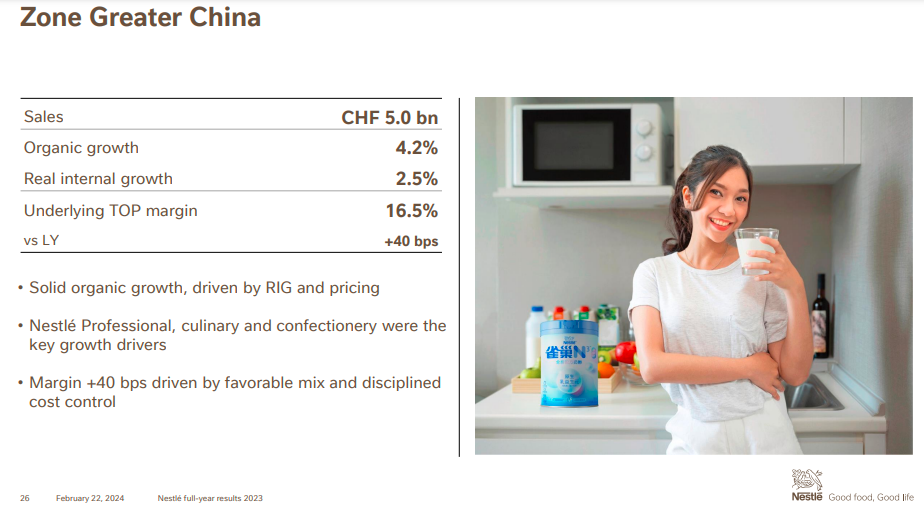 根據(jù)雀巢最新財報,2023年全年,雀巢集團的有機增長率達到7.2%,定價貢獻率達到7.5%。其中,雀巢大中華大區(qū)有機增長率4.2%,其中實際內(nèi)部增長率(注:相當于銷量貢獻率)2.5%,定價貢獻率1.7%。
