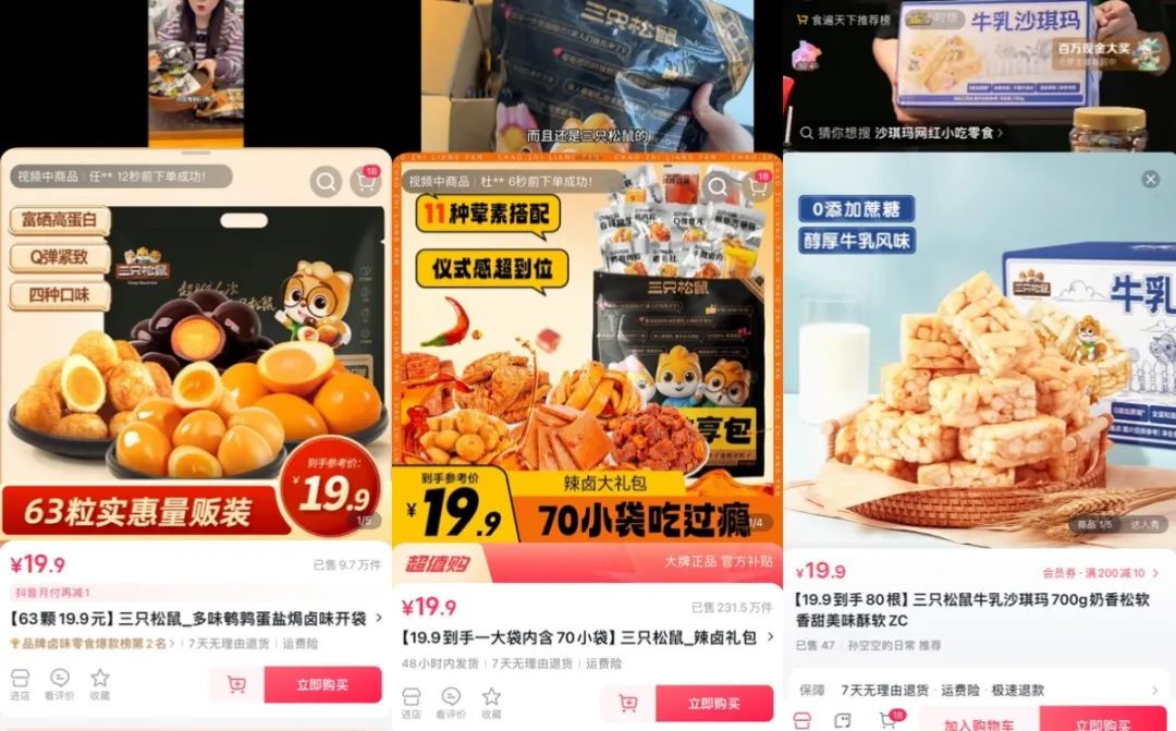 以夏威夷果為切口,三只松鼠打開了抖音渠道的運營思路。觀察三只松鼠在抖音上的爆款產(chǎn)品不難發(fā)現(xiàn),其寄希望于復制夏威夷果的成功,三只松鼠后續(xù)推出的多款產(chǎn)品都延續(xù)了19.9元量販大包裝、高性價比的形式,如19.9元70小袋的辣鹵禮包,19.9元80根的沙琪瑪,19.9元的量販裝每日堅果等。