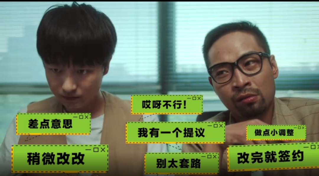 在一張定檔海報中,一份份寫著“定稿細(xì)節(jié)調(diào)整版”“重新定稿版(1)”“最最新最終定稿(2)”“3.30改回第一稿(終)”等文檔如同一座座大山,壓著主演宋木子、合文俊喘不過氣;而在合文俊修改文檔的電腦上,小小的李飛比出一個個弱弱的OK手勢,也是乙方最常用的表情;加上背景中綠屏故障的效果,這些元素透露著濃濃“社畜”味道,讓人每位熬夜改稿的乙方心生共鳴。