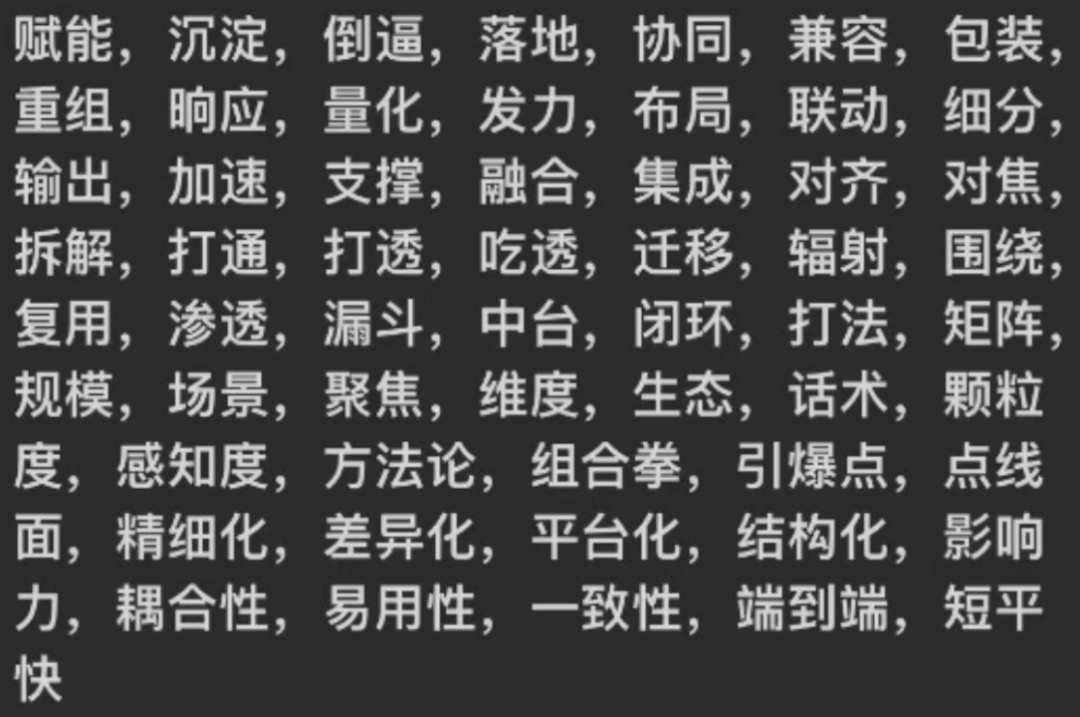 過去二十年間,互聯(lián)網(wǎng)企業(yè)的快速成長創(chuàng)造了一批互聯(lián)網(wǎng)職場新詞,也誕生了一套互聯(lián)網(wǎng)黑話。譬如,賦能客戶 = 幫用戶賺錢;信息分發(fā) = 在這個平臺發(fā)視頻、圖片、文章;實現(xiàn)深度共建、形成組合拳 = 視頻、圖片、文章一起發(fā)。下面有張圖,大家看看日常中遇到了多少?
