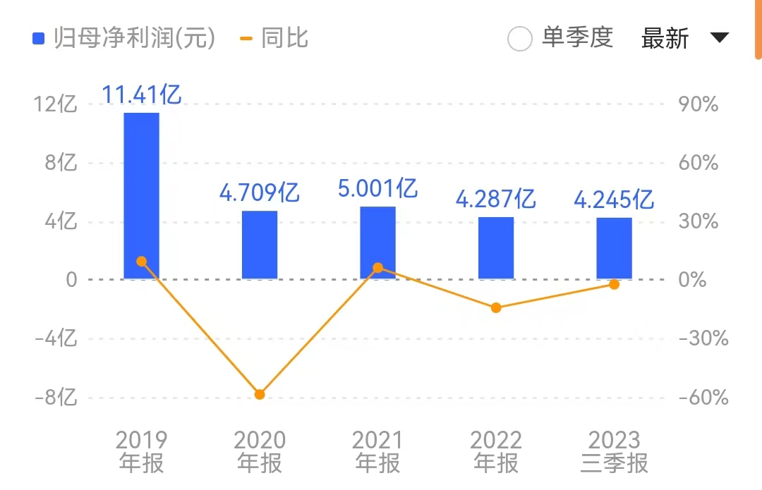 以“葡萄酒一哥”張?jiān)為例,自2019年之后,公司凈利潤(rùn)長(zhǎng)年在4-5億元之間徘徊。2023年前三季度,公司實(shí)現(xiàn)凈利潤(rùn)4.25億元,較去年同期下降2.26%。