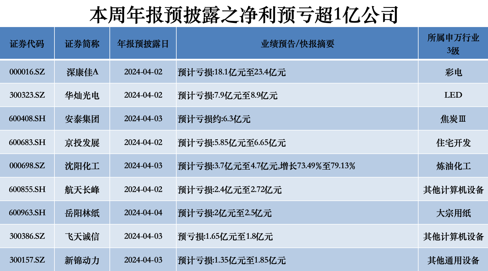 本周還有11家公司將披露虧損年報(bào),根據(jù)預(yù)告,9家公司凈利潤(rùn)虧損金額上億。其中,深康佳A(000016.SZ)虧損金額最高,預(yù)計(jì)虧損18.1億元至2.34億元;其次是華燦光電(300323.SZ)預(yù)虧7.9億元至8.9億元;此外,安泰集團(tuán)(600408.SH)預(yù)計(jì)虧損6.3億元,京投發(fā)展(600683.SH)預(yù)計(jì)虧損5.85億元至6.65億元。