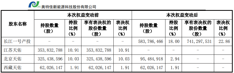 本次權(quán)益變動(dòng)后,長江一號(hào)產(chǎn)投持有奧特佳583,786,466股股份,占上市公司總股本的18%,享有表決權(quán)的股份數(shù)量為741,297,531股,表決權(quán)比例為22.86%;長江一號(hào)產(chǎn)投成為公司的控股股東,湖北省國資委將成為奧特佳的實(shí)際控制人。