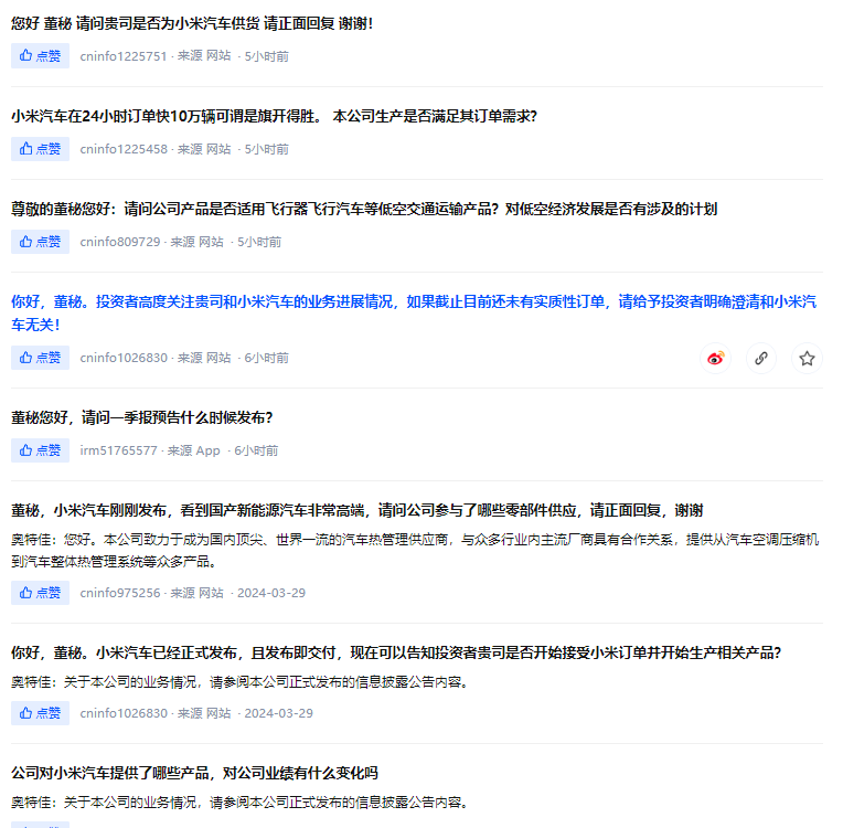 奧特佳曾在2023年11月18日在互動(dòng)平臺(tái)上回復(fù)投資者稱,子公司空調(diào)國際已接受小米汽車客戶定點(diǎn),未來會(huì)在客戶正式啟動(dòng)生產(chǎn)后根據(jù)訂單提供汽車熱管理產(chǎn)品。而奧特佳控股子公司埃泰斯也曾獲得小米旗下基金入股;2022年8月,奧特佳在互動(dòng)平臺(tái)表示,海南極目創(chuàng)業(yè)投資有限公司系小米私募股權(quán)基金管理有限公司的全資子公司,于今年初入股本公司控股子公司埃泰斯,是基于其對(duì)埃泰斯業(yè)務(wù)前景的看好。