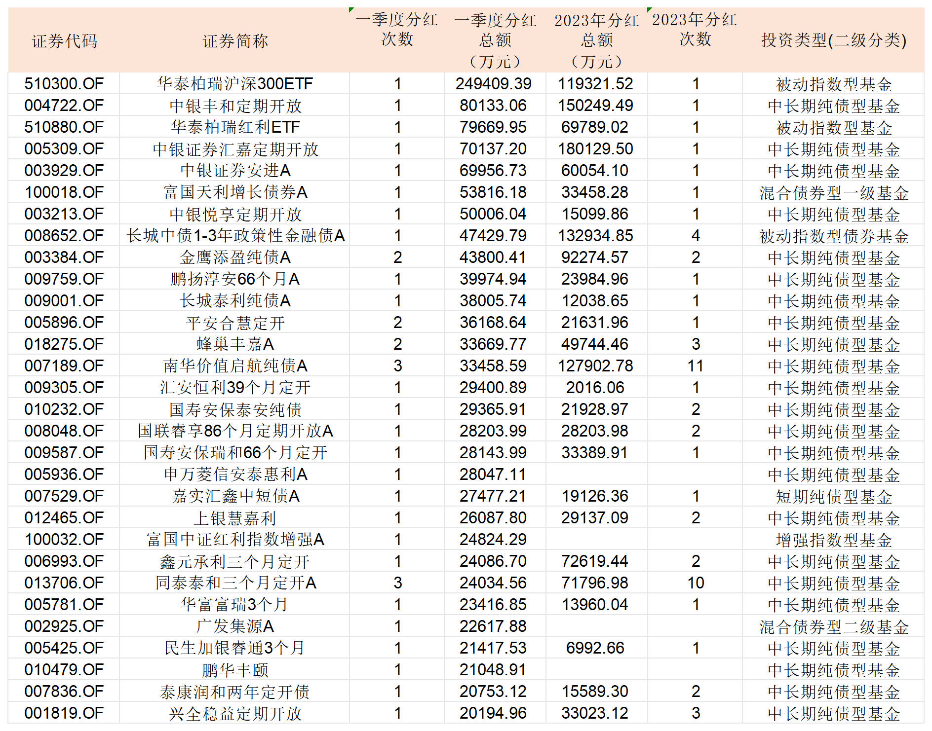 中銀豐和定期開放、中銀證券匯嘉定期開放、富國天利增長債券等基金的分紅總額也排名居前。