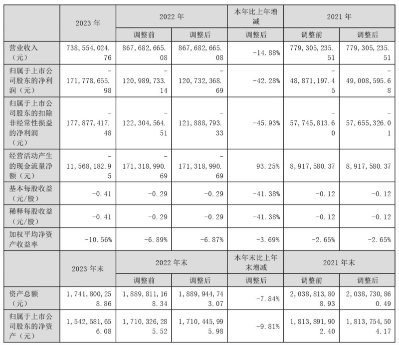 根據(jù)年報(bào),飛天誠(chéng)信在2023年度實(shí)現(xiàn)營(yíng)業(yè)收入7.39億元,較去年同期減少14.88%;實(shí)現(xiàn)歸屬于上市公司股東的凈利潤(rùn)-1.72億元,較去年同期虧損擴(kuò)大42.28%,出現(xiàn)了連續(xù)三年虧損(2021年和2022年分別虧損0.49億元和1.21億元);其中,歸屬于上市公司股東的扣非后凈利潤(rùn)為-1.78億元,同比虧損擴(kuò)大了45.93%。