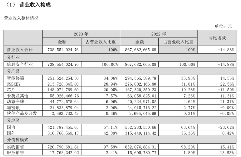 2023年度,智能終端系統(tǒng)的營(yíng)業(yè)收入為25152.43萬(wàn)元,占營(yíng)業(yè)收入總額的34.06%,比上年同期減少了14.55%;銀行是USB Key產(chǎn)品主要的需求方,但該產(chǎn)品需求繼續(xù)下降,USB Key產(chǎn)品創(chuàng)造的營(yíng)業(yè)收入為21372.83萬(wàn)元,占營(yíng)業(yè)收入總額的28.94%,同比減少22.56%;芯片產(chǎn)品的營(yíng)業(yè)收入為14807.48萬(wàn)元,占公司營(yíng)業(yè)收入總額的20.05%,比上年同期減少11.50%。