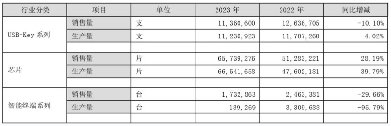 在飛天誠(chéng)信的三大產(chǎn)品中,芯片的產(chǎn)量和銷量在2023年度均有較大幅度的增長(zhǎng),但USB Key系列產(chǎn)品和智能終端系列產(chǎn)品的銷量同比均出現(xiàn)明顯的減少。其中,USB Key系列產(chǎn)品銷量減少127.61萬(wàn)支,智能終端系列產(chǎn)品銷量減少73.05萬(wàn)臺(tái)且產(chǎn)量從330.97萬(wàn)臺(tái)減少至13.93萬(wàn)臺(tái)。