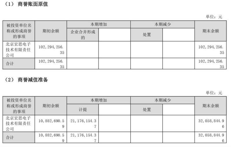 正因?yàn)楹晁茧娮映霈F(xiàn)了虧損,飛天誠(chéng)信對(duì)其相關(guān)商譽(yù)計(jì)提了2117.62萬(wàn)元的減值準(zhǔn)備,并表示,如果未來(lái)宏思電子的盈利能力出現(xiàn)下降趨勢(shì),仍存在商譽(yù)減值的風(fēng)險(xiǎn)。