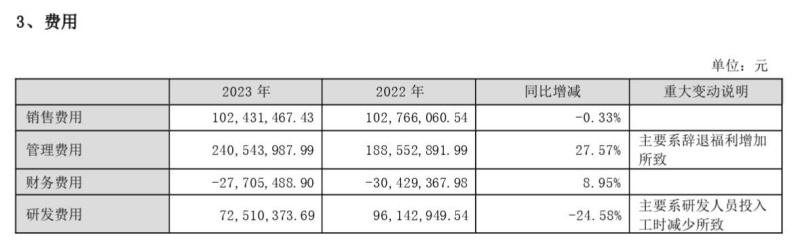 2023年度,飛天誠(chéng)信的管理費(fèi)用同比增長(zhǎng)27.57%,比上年增加了5199.11萬(wàn)元,也對(duì)當(dāng)期利潤(rùn)產(chǎn)生了比較大的影響。年報(bào)顯示,管理費(fèi)用的增長(zhǎng),主要是辭退福利增加所致;而研發(fā)費(fèi)用同比減少24.58%,主要是研發(fā)人員投入工時(shí)減少所致。
