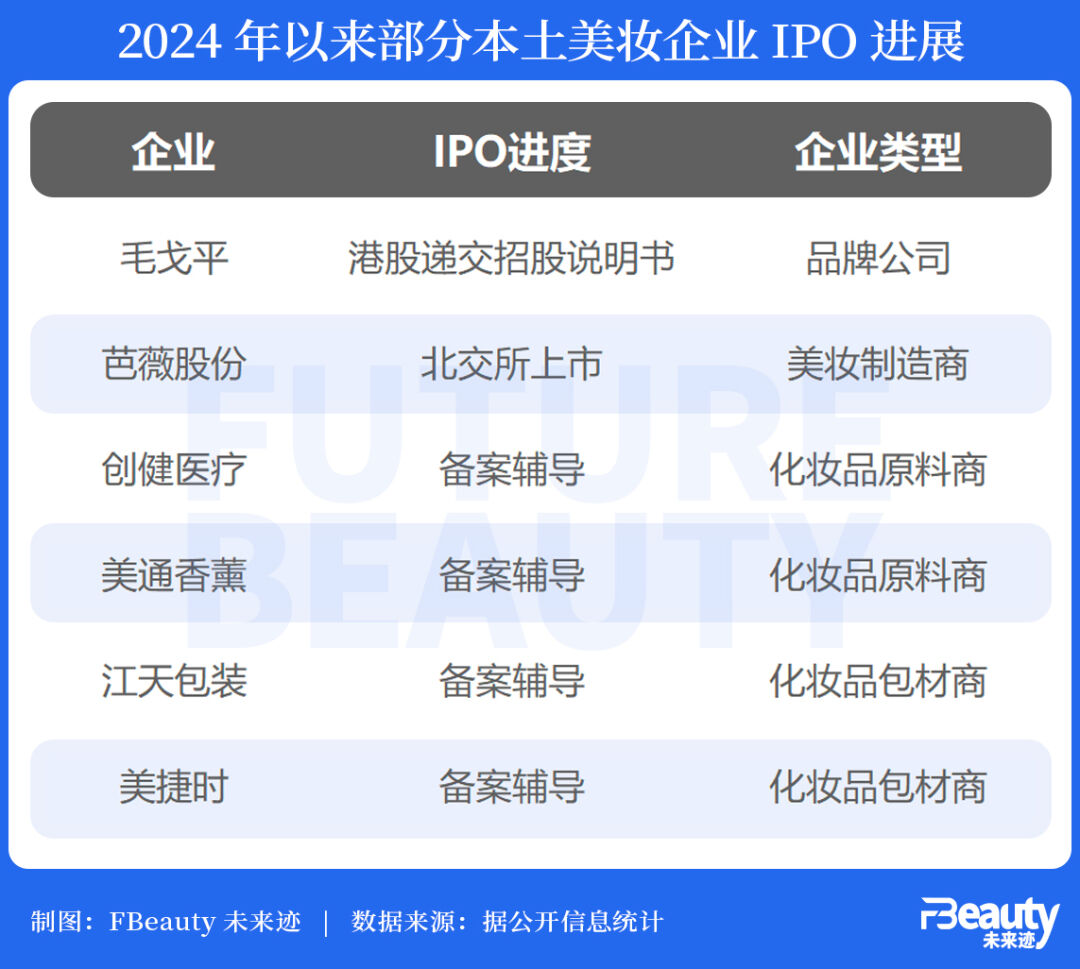 《FBeauty未來跡》此前統(tǒng)計發(fā)現(xiàn),2023年中有至少20家涉及IPO相關(guān)進程的中國美妝相關(guān)企業(yè),但僅有美麗田園、敷爾佳、錦波生物和天圖投資四家公司成功闖關(guān),毛戈平、蜜思膚、拉拉米、環(huán)亞等公司或受阻處于中止或撤回終止?fàn)顟B(tài)。