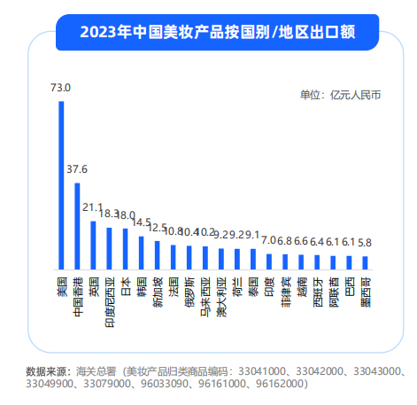 《中國美妝出海洞察報告》中的數(shù)據(jù)顯示,2023年中國美妝產(chǎn)品對美國出口額達73億元,另外日韓市場對中國美妝產(chǎn)品的進口需求正持續(xù)爆發(fā)。