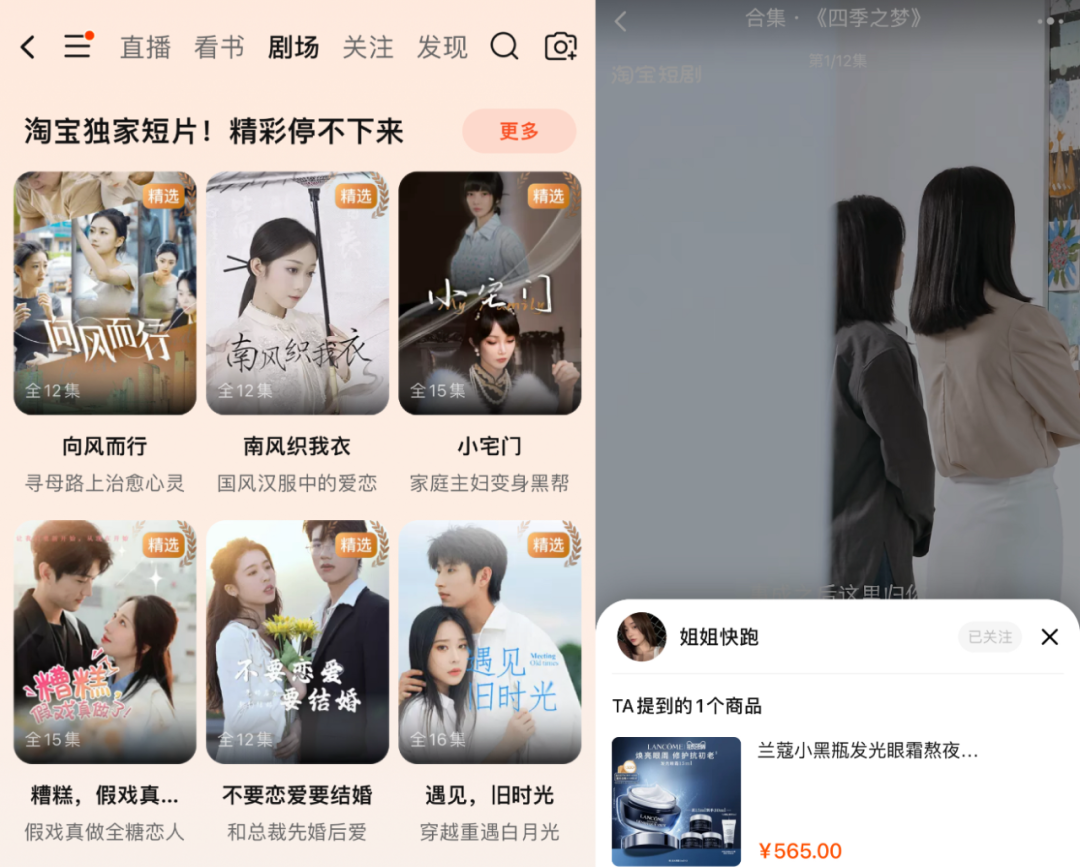 可以說(shuō),淘寶短劇的“電商味”還是獨(dú)樹(shù)一幟的,在該區(qū)塊的這些短劇里,我們幾乎可以在每部劇播放頁(yè)面看到淘寶商品的跳轉(zhuǎn)按鈕,比如《入職啟示錄》的左下角掛有「TA提到的寶貝」“嬌韻詩(shī)”系列商品鏈接;由蘭蔻冠名的《四季之夢(mèng)》每集播放頁(yè)則都附有“蘭蔻小黑瓶發(fā)光眼霜”的商品鏈接。