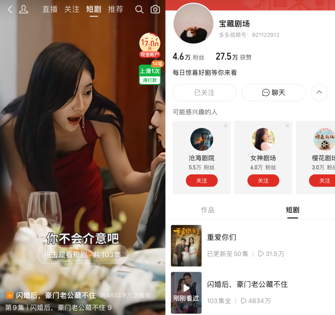 另一方面,可以發(fā)現(xiàn),拼多多短劇的站內(nèi)傳播邏輯與京東相似,都是主要基于平臺(tái)賬號(hào)UGC生態(tài)來(lái)喂養(yǎng)短劇,只不過(guò)拼多多的短劇賬號(hào)不一定是商家,也可能是純內(nèi)容賬號(hào)搭配商品轉(zhuǎn)化鏈路的玩法。