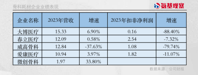 威高骨科表現(xiàn)同樣拉胯。2023年,公司營收降幅為37%,扣非凈利潤降幅達到79%。當然,上述巨頭們增收不增利的表現(xiàn),部分企業(yè)可能說是暫時的。