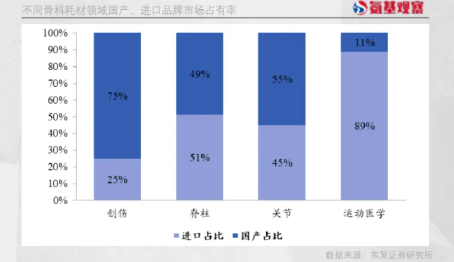根據(jù)《中國醫(yī)療器械藍皮書(2022)》,國產(chǎn)耗材在創(chuàng)傷領(lǐng)域的市場占有率已經(jīng)達到75%,在脊柱、關(guān)節(jié)和運動醫(yī)學(xué)領(lǐng)域,國產(chǎn)品牌占比仍有待提升。