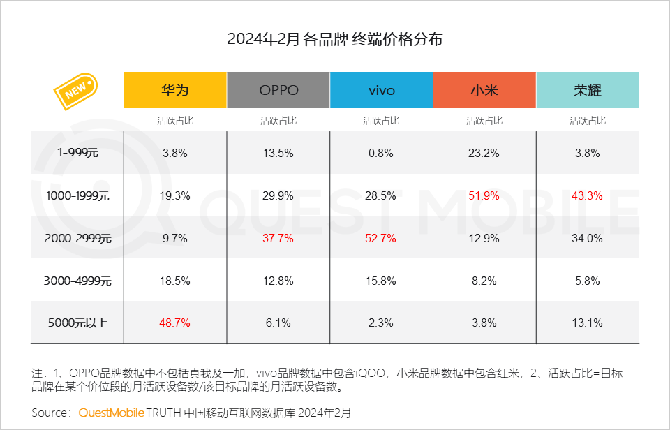 2024年第一季度,靠著新機(jī)Redmi A3以及總體銷量,小米以14%市場(chǎng)份額位列三星、蘋(píng)果之后,奪得第三。小米14系列憑借口碑在高端市場(chǎng)獲得一席之地,但小米手機(jī)品牌本身的高端定位仍不穩(wěn)固。QuestMobile報(bào)告顯示,不同于華為,小米手機(jī)用戶活躍占比最大部分仍集中在1000-1999元的價(jià)格區(qū)間內(nèi)。