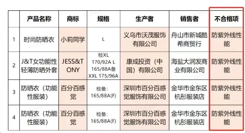 無獨有偶,浙江省市場監(jiān)管局也于近期發(fā)布了功能性服裝質(zhì)量監(jiān)督抽查通告,共計檢出4批防曬衣不合格,還都是核心功能“防曬”不過關(guān),讓人直呼“傷不起”。