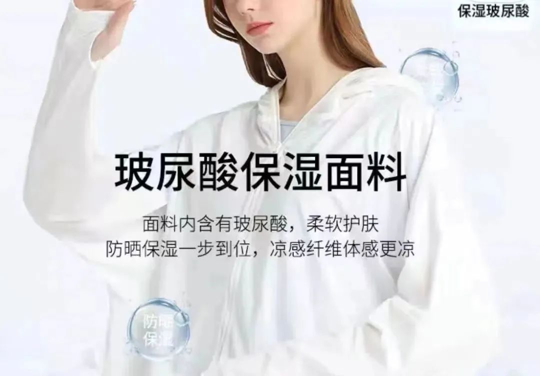 有的防曬衣則將賣點定位于“護膚”,某品牌推出的“面膜防曬衣”系列,就號稱在面料內(nèi)注入了“762MG/kg玻尿酸”,當皮膚與之接觸,玻尿酸就會被釋放出來,“相當于敷了一層面膜,穿上后肌膚含水量比不穿高出36%?!?/p>