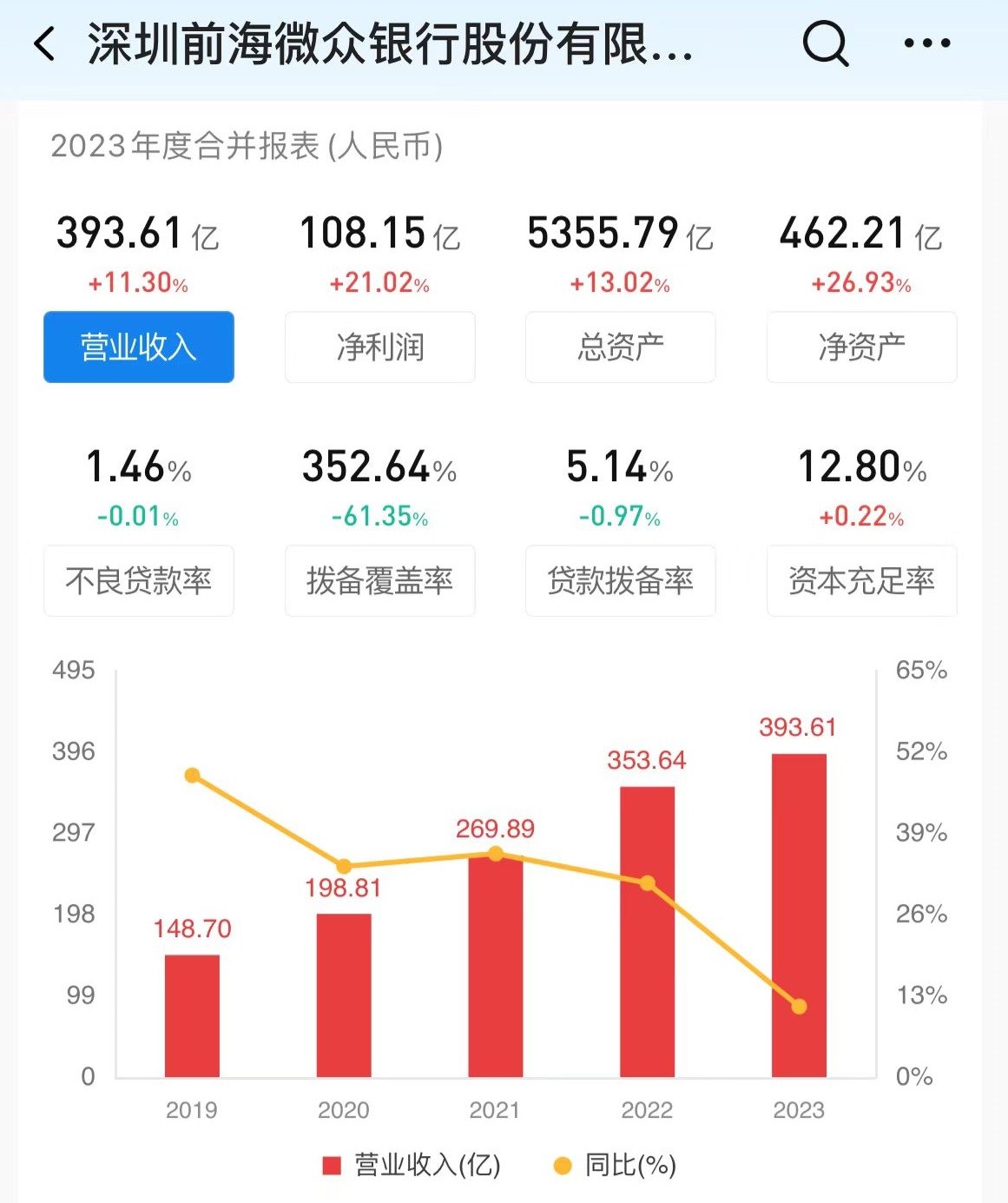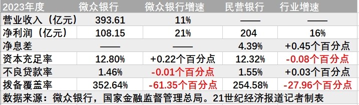 2023年,微眾銀行錄得營收393.61億元,同比增長11.3%;凈利潤108.15億元,同比增長21.02%。