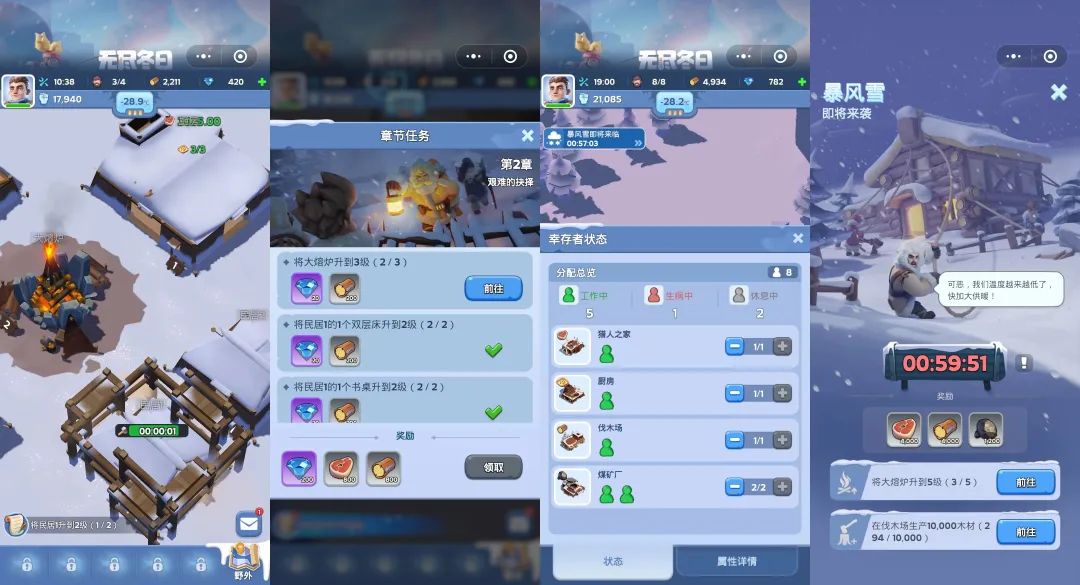 游戲的早期階段以“經(jīng)營”模塊為主,玩家需要根據(jù)任務(wù)引導(dǎo),分配幸存者,去從事獵人、廚師、伐木工人等等工作,收集食物、木材等資源,然后利用這些資源去升級建筑,提升資源收集效率,挽救更多幸存者,度過艱難的暴風(fēng)雪挑戰(zhàn),優(yōu)化幸存者的生活環(huán)境,達(dá)成資源生產(chǎn)與消耗的有機(jī)循環(huán)。