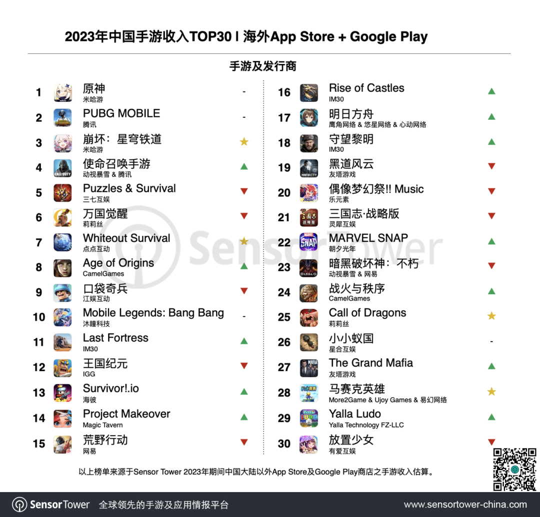 去年2月,該游戲在大陸外市場正式上線后,僅花費(fèi)了不到半年的時(shí)間,就沖上了多個(gè)國家和地區(qū)的暢銷榜TOP10,同時(shí)游戲收入也迅猛增長。據(jù)Sensor Tower發(fā)布的數(shù)據(jù),該游戲在2023年全球累計(jì)收入達(dá)到了驚人的全球3.7億美元,一舉沖上了2023年度國產(chǎn)游戲出海收入榜單的第7名,它也是2023年沖上該榜單TOP7的唯二新游之一,另一款是米哈游旗下的《崩壞:星穹鐵道》。