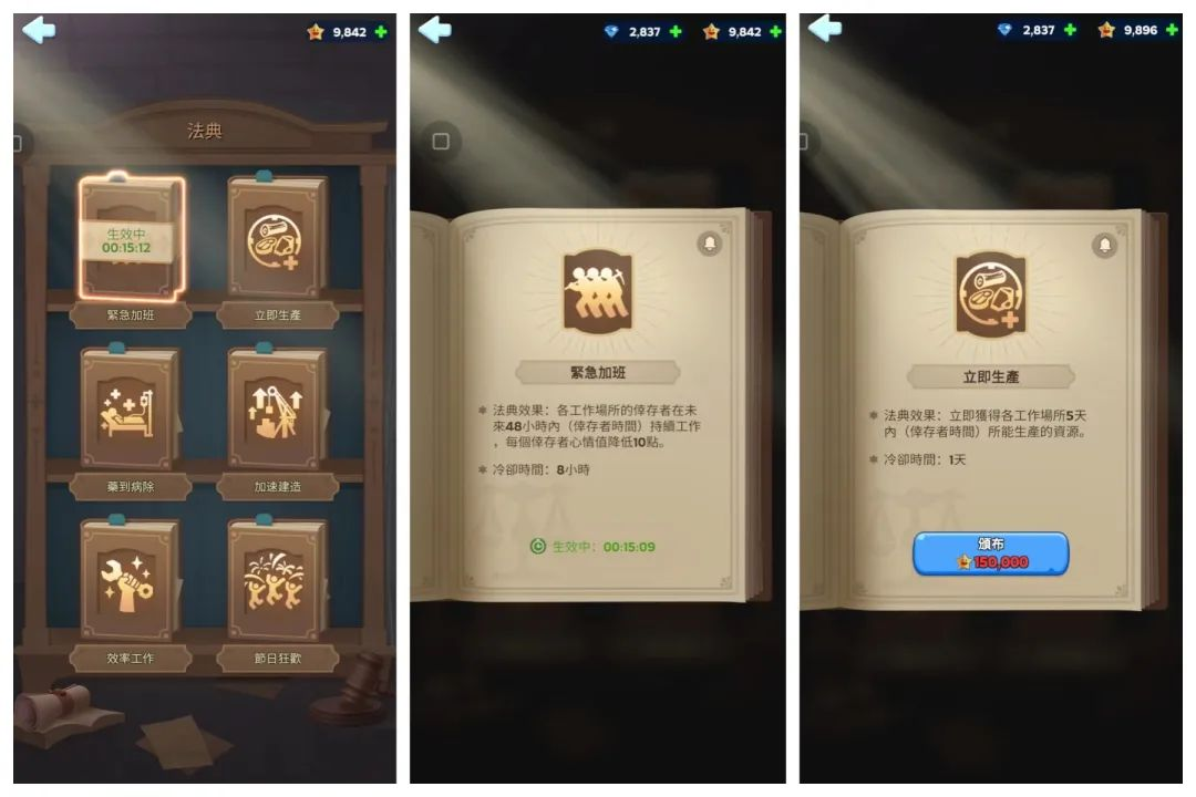 同時(shí),玩家從居民身上收集而來的“滿意度”,還可用于頒布“法典”,更加靈活地協(xié)調(diào)城鎮(zhèn)經(jīng)營效率。比如頒布“緊急加班”法典后,幸存者會持續(xù)工作48小時(shí),同時(shí)心情值降低10點(diǎn);“立即生產(chǎn)”法典生效后,玩家將立即獲得幸存者在5天內(nèi)可產(chǎn)出的資源。