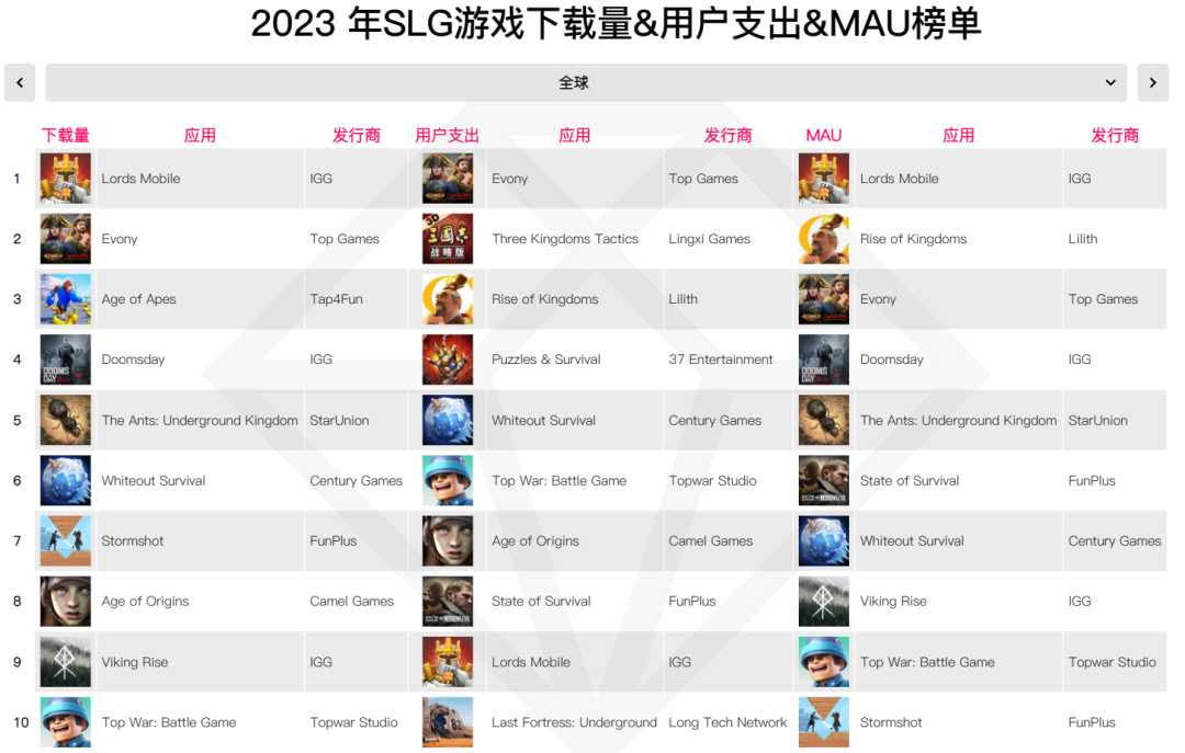 據(jù)data.ai統(tǒng)計(jì),2023年登上全球SLG下載量、用戶支出和MAU榜單前十的全是國產(chǎn)游戲。可以說,在全球市場上,SLG賽道不僅是中國廠商掙錢的舒適區(qū),還是我們的統(tǒng)治區(qū)。