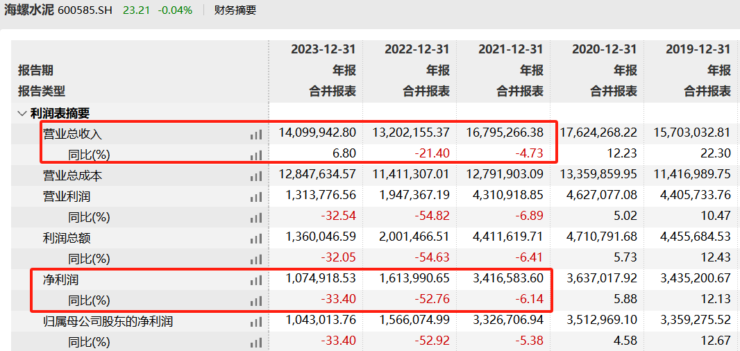 從2021年開始,海螺水泥盈利能力有所下降。2023年實現(xiàn)營業(yè)收入1410億元,同比增長6.8%;實現(xiàn)歸屬于上市公司股東的凈利潤104.3億元,同比減少33.4%。