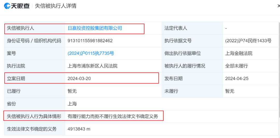 據(jù)天眼查顯示,日贏投資當前涉18起官司,其中一起案件被執(zhí)行金額491.38萬元,但全部未履行,而且是“有履行能力而拒不履行生效法律文書確定義務(wù)”,因此已被列為失信被執(zhí)行人。