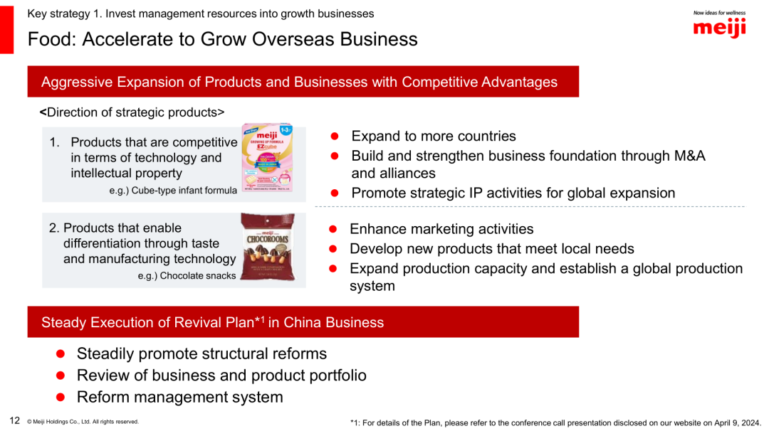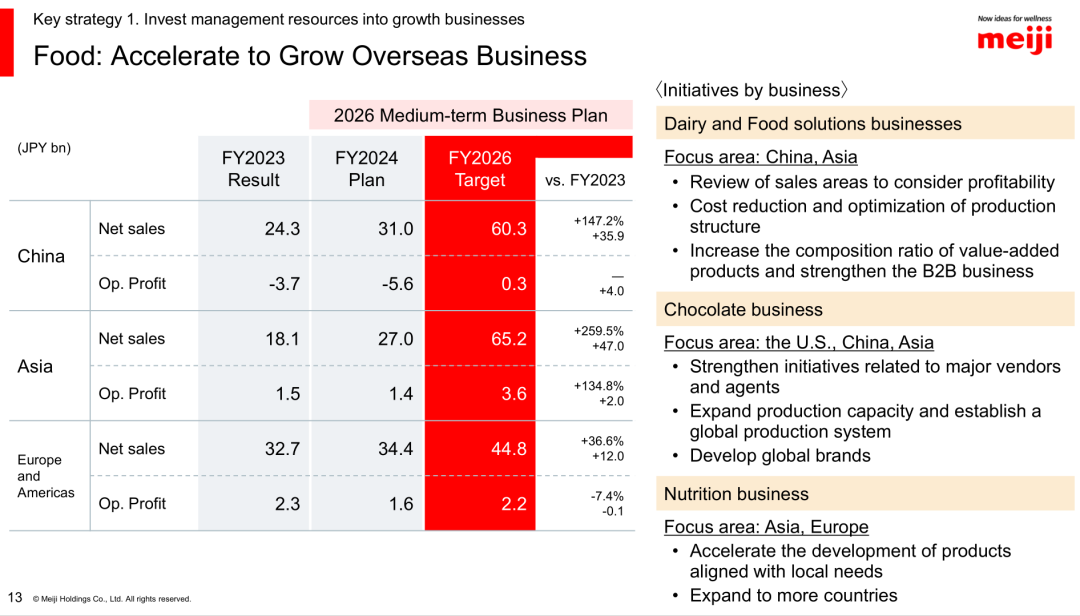 小食代留意到,進(jìn)入2024財年,明治正式開啟了2026中期業(yè)務(wù)計劃(2024-2026財年)。針對食品業(yè)務(wù),該公司提出將加速海外業(yè)務(wù)增長,而中國市場的復(fù)興成為當(dāng)中重點(diǎn)。