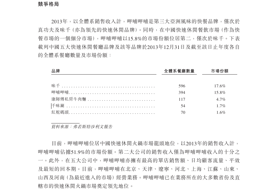 轉(zhuǎn)折點(diǎn)是2008年,呷哺獲得了知名PE英聯(lián)資本投資5000萬(wàn)美元,開(kāi)始快速擴(kuò)張,并在2014年于港交所上市。根據(jù)招股書(shū),根據(jù)弗若斯特沙利文報(bào)告,以2013年銷售收入計(jì)算,呷哺占據(jù)「中國(guó)快速休閑火鍋市場(chǎng)」51.9%的市場(chǎng)份額,第二大銷售收入僅為呷哺收入的十分之一。