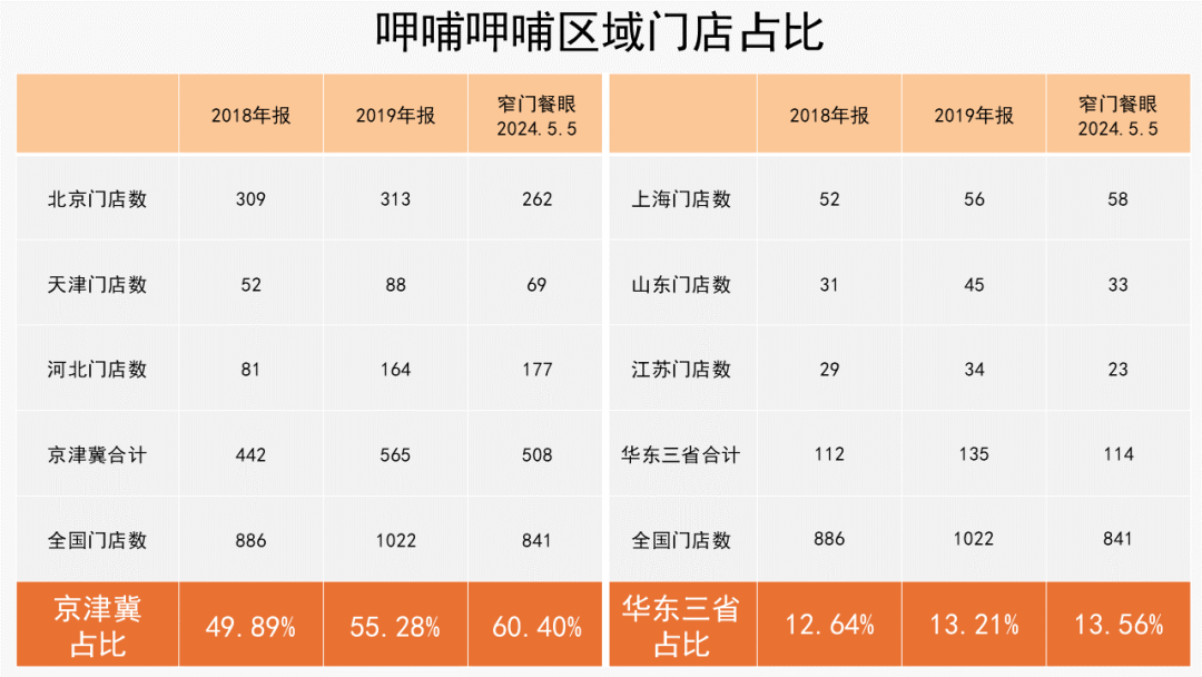 對(duì)比窄門餐眼2024年5月5日與呷哺2019年年報(bào)的數(shù)據(jù)。京津冀地區(qū)門店占比不降反升,從55.28%上升至60.4%。上海、山東、江蘇華東三省門店占比僅從13.21%上升至13.56%。(2019年年報(bào)華東地區(qū)僅上海、江蘇、山東三省門店數(shù)單獨(dú)列出)