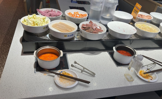原因是這樣的,「如果用大盤夾取,很多人會(huì)吃更多品類的產(chǎn)品,每個(gè)品類夾取的也不會(huì)太多,直接放在鍋里或盤子上,慢慢吃飽的時(shí)候會(huì)控制量,因此損耗不會(huì)太多」。小份菜既占用桌面空間,每一份中也會(huì)剩下菜品,同時(shí)還會(huì)增加更多的人力。