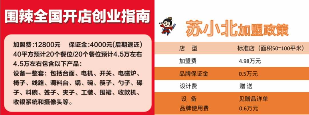 首先,圍辣小火鍋、蘇小北等區(qū)域品牌擴(kuò)張較快,雖然形象有所提升,但實(shí)際上依然傳統(tǒng)。首先加盟門檻比較低,加盟費(fèi)由品牌使用費(fèi)、設(shè)計(jì)費(fèi)、設(shè)備費(fèi)構(gòu)成,只需要5萬(wàn)元。