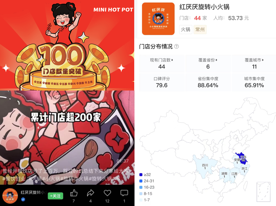 一些傳統(tǒng)品牌對(duì)于品牌發(fā)展和門店數(shù)據(jù)上,也存在虛假宣傳的情況。紅厭厭小火鍋的招商自稱在火鍋行業(yè)做了十多年,門店數(shù)突破100家。在視頻號(hào)中,還出現(xiàn)了200家的說(shuō)法。
