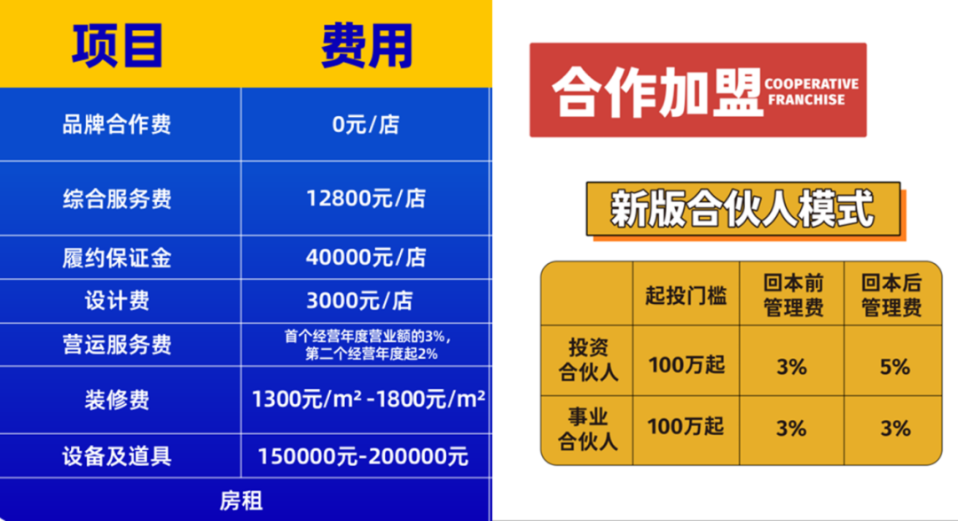 同時(shí),這些品牌的加盟費(fèi)/合伙人的費(fèi)用也相對(duì)較高。不包括房租,100平米面積門店的前期投資就超過(guò)33萬(wàn)。開(kāi)業(yè)后,還將按照經(jīng)營(yíng)年度營(yíng)業(yè)額收取一定比例的營(yíng)運(yùn)服務(wù)費(fèi)。龍歌則是「直營(yíng)管理」,品牌負(fù)責(zé)整體管理和運(yùn)營(yíng),無(wú)論是投資合伙人還是事業(yè)合伙人,起投金額均100萬(wàn)起,并按一定比例收取管理費(fèi)。