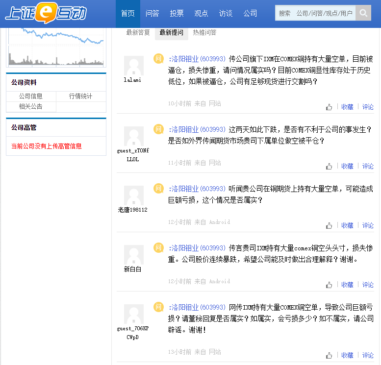 當(dāng)日早盤,有多位投資者突然在互動平臺追問洛陽鉬業(yè):“傳公司旗下IXM在COMEX銅持有大量空單,目前被逼倉,損失慘重,請問情況屬實嗎?目前COMEX銅顯性庫存處于歷史低位,如果被逼倉,公司有足夠現(xiàn)貨進行交割嗎?”“傳言貴司IXM持有大量COMEX銅空頭頭寸,損失慘重。公司股價連續(xù)暴跌,希望公司能及時做出合理解釋?”
