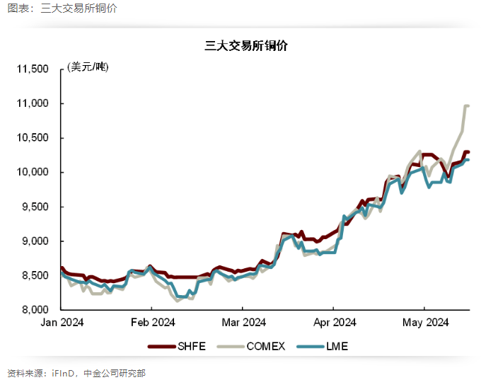 中金公司大宗商品團隊5月16日發(fā)文表示,今年4月初至今,COMEX銅庫存幾乎連續(xù)去庫,由4月初的接近3萬噸下降至5月14日的2.1萬噸。“結(jié)合全球精煉銅的供給情況,預(yù)計中國銅產(chǎn)量增長是全球銅產(chǎn)量上升的主要貢獻力量,而COMEX無法接受中國品牌精煉銅交割,這或許也成為了COMEX銅價溢價擴大的原因之一?!?/strong>