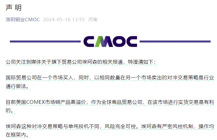 隨后下午13時55分,洛陽鉬業(yè)官方微信緊急發(fā)布聲明稱,旗下貿(mào)易公司埃珂森(IXM)這種對沖交易策略與單純投機不同,風(fēng)險完全可控。埃珂森有嚴(yán)密風(fēng)控機制,操作均在框架內(nèi)。