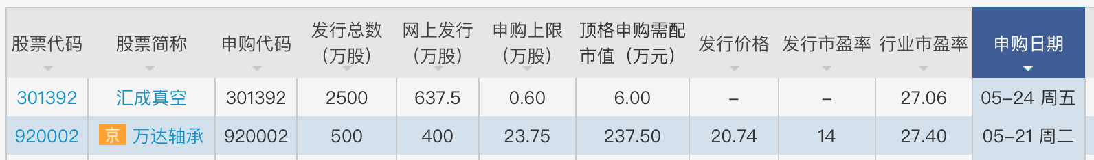 此外,5月24日周五,市場(chǎng)也可申購(gòu)創(chuàng)業(yè)板公司匯成真空(301392.SZ),其發(fā)行總數(shù)為2500萬(wàn)股,網(wǎng)上發(fā)行637.5萬(wàn)股,申購(gòu)上限為0.6萬(wàn)股,頂格申購(gòu)需配市值6萬(wàn)元,公司所屬行業(yè)的市盈率為27.06倍。