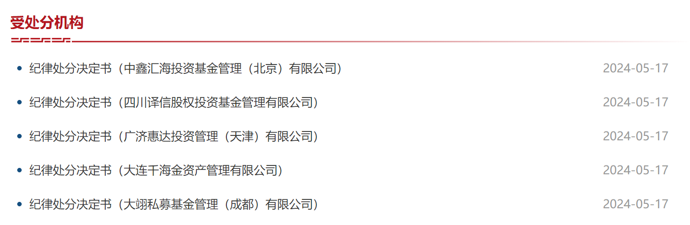 5月17日,中國(guó)證券投資基金業(yè)協(xié)會(huì)(以下簡(jiǎn)稱“中基協(xié)”)發(fā)布5張紀(jì)律處分決定書,劍指大翊私募基金管理(成都)有限公司、大連千海金資產(chǎn)管理有限公司、廣濟(jì)惠達(dá)投資管理(天津)有限公司、四川譯信股權(quán)投資基金管理有限公司、中鑫匯海投資基金管理(北京)有限公司5家私募。其中,大連千海金資產(chǎn)管理有限公司(以下簡(jiǎn)稱“大連千海金”)被撤銷管理人登記。