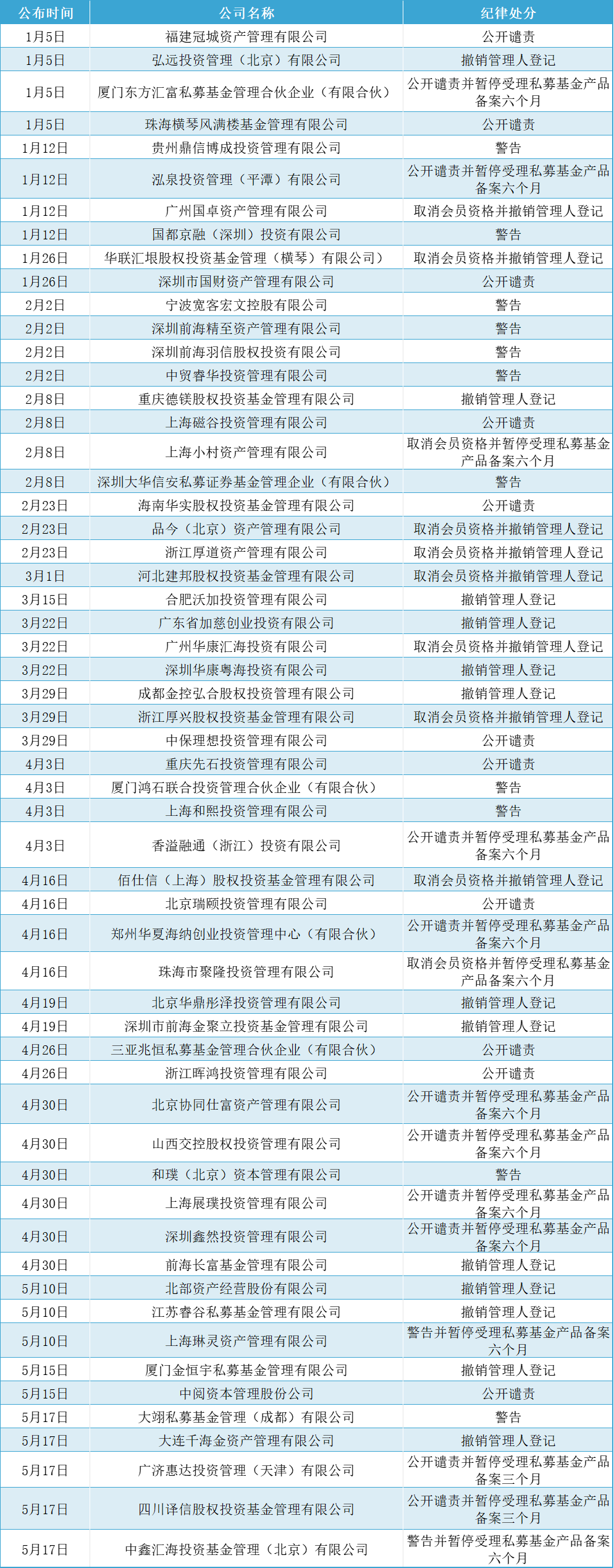 根據(jù)中基協(xié)網(wǎng)站統(tǒng)計(jì),截至5月17日,今年以來,中基協(xié)已經(jīng)發(fā)布57份處分決定書。紀(jì)律處分內(nèi)容包括警告、公開譴責(zé)、取消會(huì)員資格等。